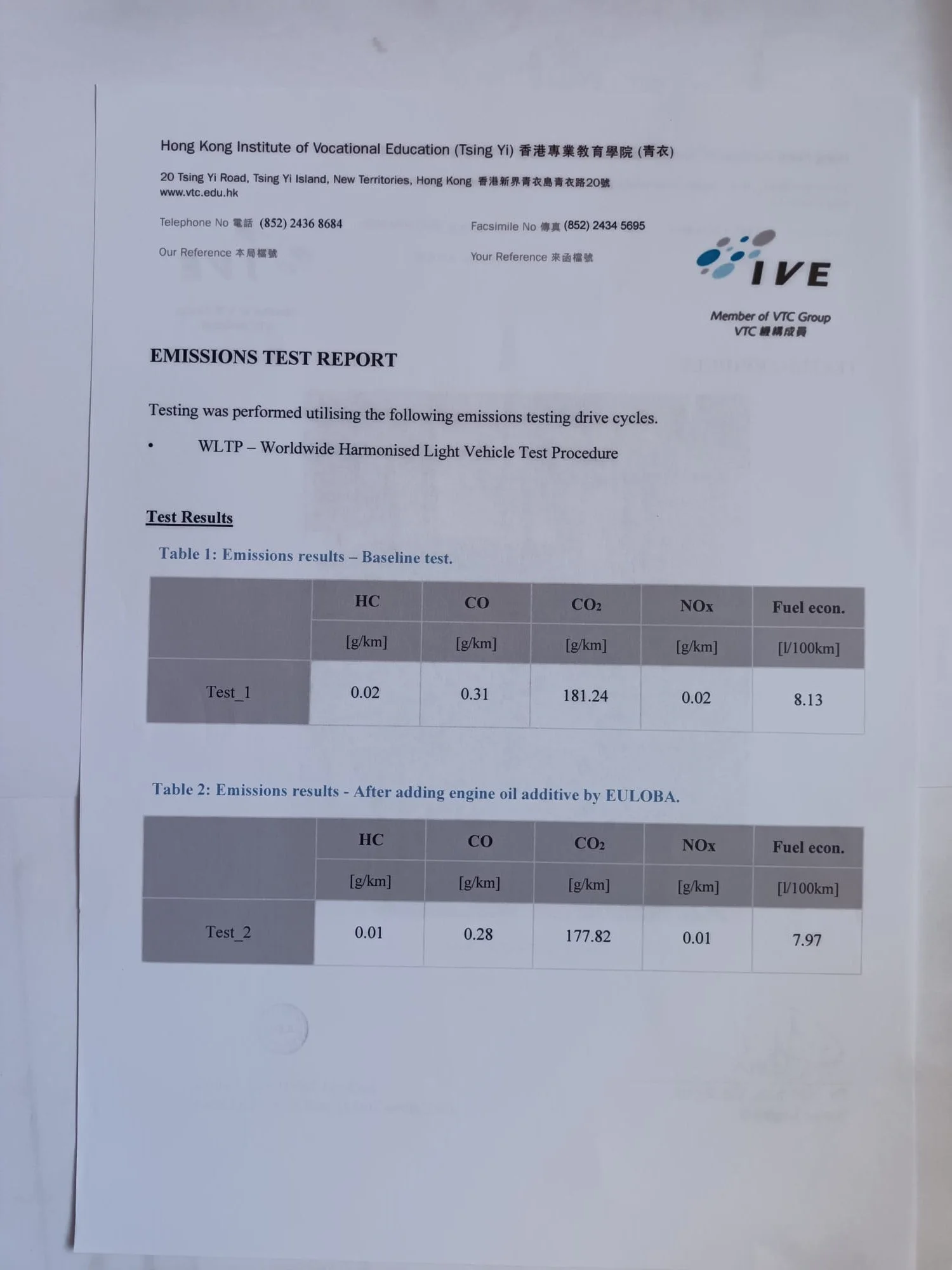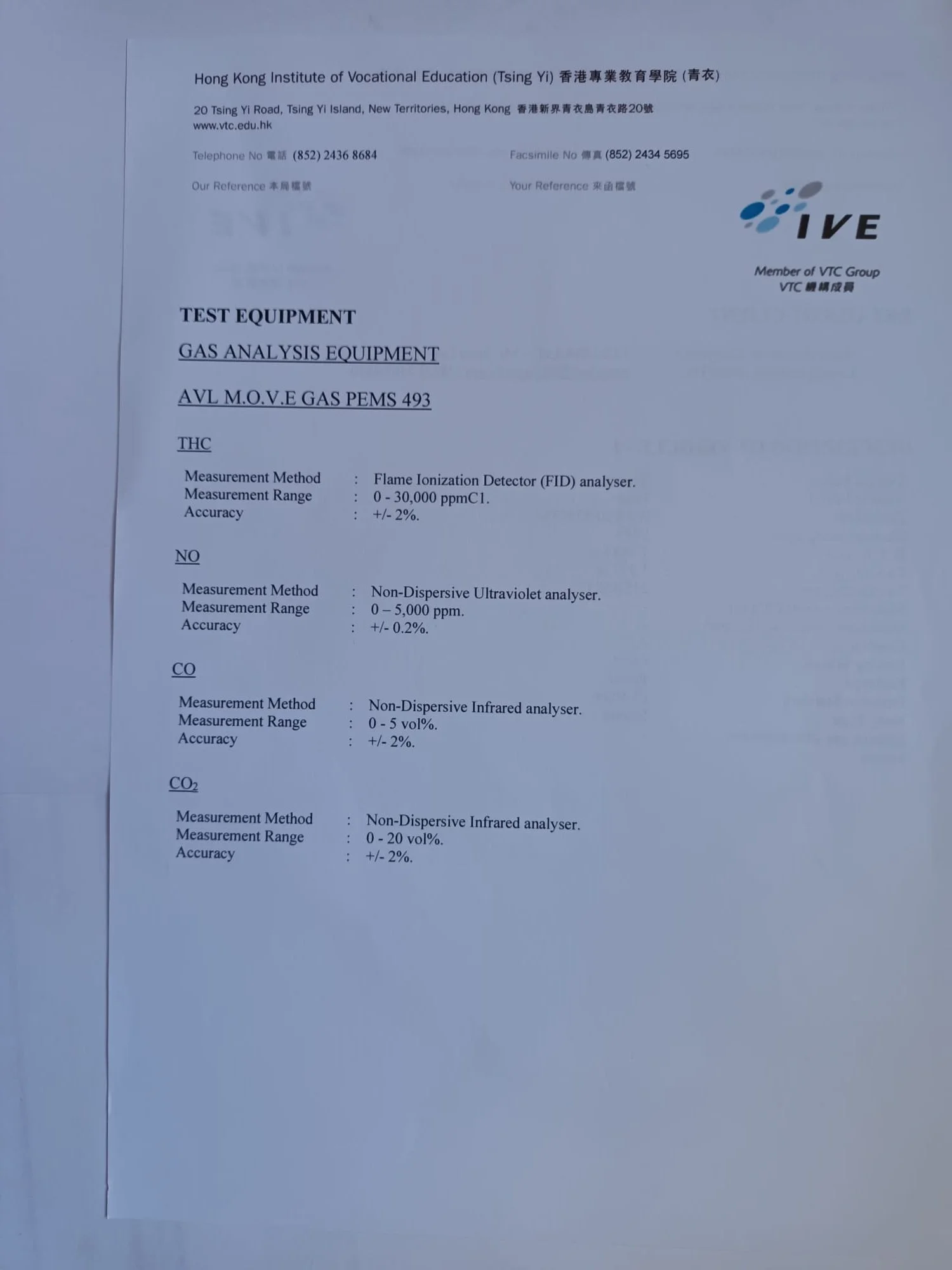 Emission report in accordance with EU Standards tested by the Hong Kong Institute of Vocational Education (Tsing Yi) for credibility and validity